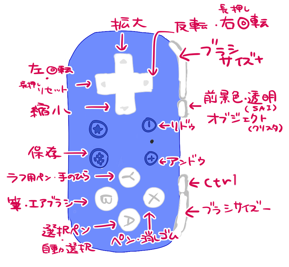 やることとしては使いたいソフト側に設定してあるショートカットキーをJoy to Keyでボタンに当てはめるだけですし、ソフト側で色々な設定(長押しやボタン押す度ツール切り替えたり、ソフトごとに別のキー設定にしたり)も出来るので凄く便利。ボタン押す度切り替えたりする設定はJoy to Key以外で出来るのか私は知らないのですがこれのお陰でものすごく助かってます。あとクリスタとSAI使ってるソフトごとに設定作って自動で切り替えるように設定してます。