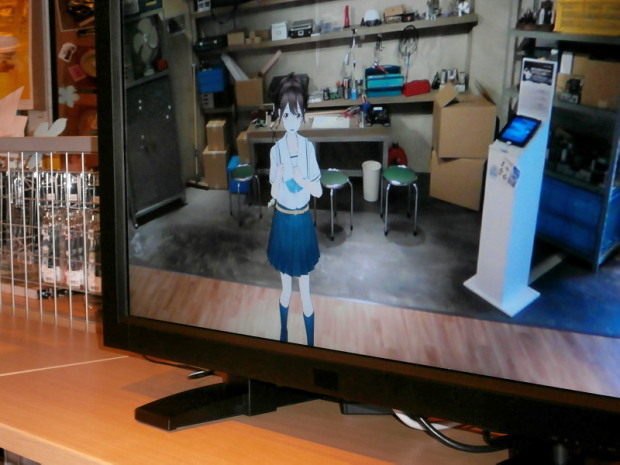 ショップスペースの横にそのままデン!とあってびびりました。手前のiPadのボタンを押すと、画面を通して部室を動き廻るアキちゃんと記念撮影ができたり。